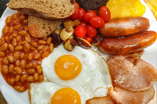 Two rashers of smoked back bacon, English sausages, hash brown, mushrooms, baked beans, tomatoes, your choice of eggs and a glass of juice